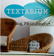 TEXTARIUM  Was ist denn das? Tex/ta/ri/um, das; ien (Raum zur Aufzucht und Pflege von Sprache, in Wort und Schrift) So oder so ähnlich könnte die Definition unseres Firmennamens lauten, wenn sie im Duden stünde. Doch bislang werden Sie den Eintrag vergeblich suchen. Zum einen, weil das TEXTARIUM erst am 01.01.2002 an den Start gegangen ist und zum anderen, weil die Definition nur einen Teil der Leistungen der Agentur abdeckt. Denn im TEXTARIUM bekommen Sie nicht nur das richtige Wort zur richtigen Zeit an den richtigen Adressaten. Wir beraten Sie in allen Fragen rund um Werbung und PR und sorgen dafür, dass Ihr Unternehmen auch visuell den richtigen Eindruck vermittelt. Durch die Zusammenarbeit mit erfahrenen Spezialisten (Grafiker, Fotografen, Web Designer, Spezial-Agenturen) ist ein flexibles und leistungsfähiges Netzwerk entstanden, von dem unsere Kunden profitieren. In unserer Referenzenliste können Sie sich ein Bild davon machen. Datenschutzerklärung Impressum  |